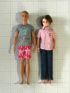 まず、両者の身長。人形の大きさは購買対象の女児が扱いやすいものになっているはずだ。両者を並べるとケンが頭半分ほど大きい。下に引いたグリッドは1センチなので、ケンが31センチ、パパが28センチほどである。仮にパパが身長170センチならば、ケンの身長は188センチとなる。なかなか現実味のある身長差だ。ところが、衣服を外して見ると興味深い真実が現れる。